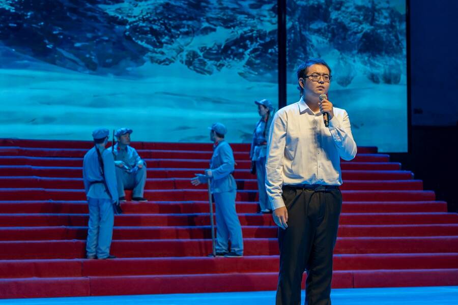 红色经典演诵会在泰和剧院铿锵上演,古琴伴奏+情景画面,矿工们用声音传承红色基因。